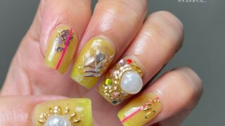 myネイル クリアイエローと淡水パールのごちゃごちゃネイル でっかい淡水パールの存在感があり過ぎる(*≧︎艸≦︎) "ドーン"とっ♪ 親指にも♡ ベースのクリアイエローは最近加わった"SUNLIT YALLOW"🌞 テンション上がる⤴️⤴️ 使用した材... 2025.09.26 myネイルジェルネイル