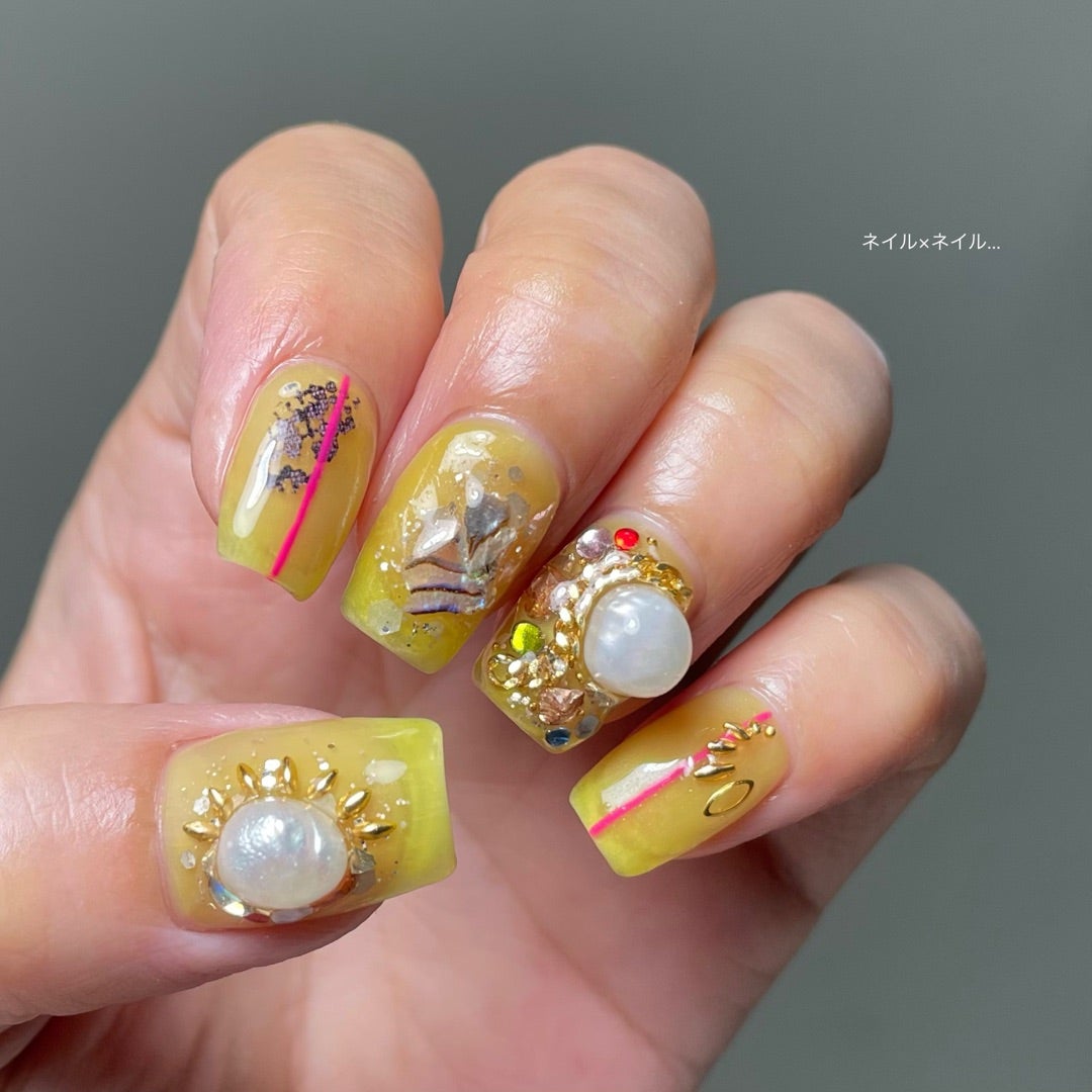 #myネイル #ジェルネイル #クリアイエローネイル #サンリットイエロー #スクエアネイル #淡水パールネイル #ごちゃごちゃネイル #でかパールネイル #セルフネイル #ネイリストネイル #使用パーツ #ネイルパーツ #ネイルショップ #沖縄市ネイルサロン #沖縄市ネイルネイル #ネイルネイルゆきな #やらゆきなブログ