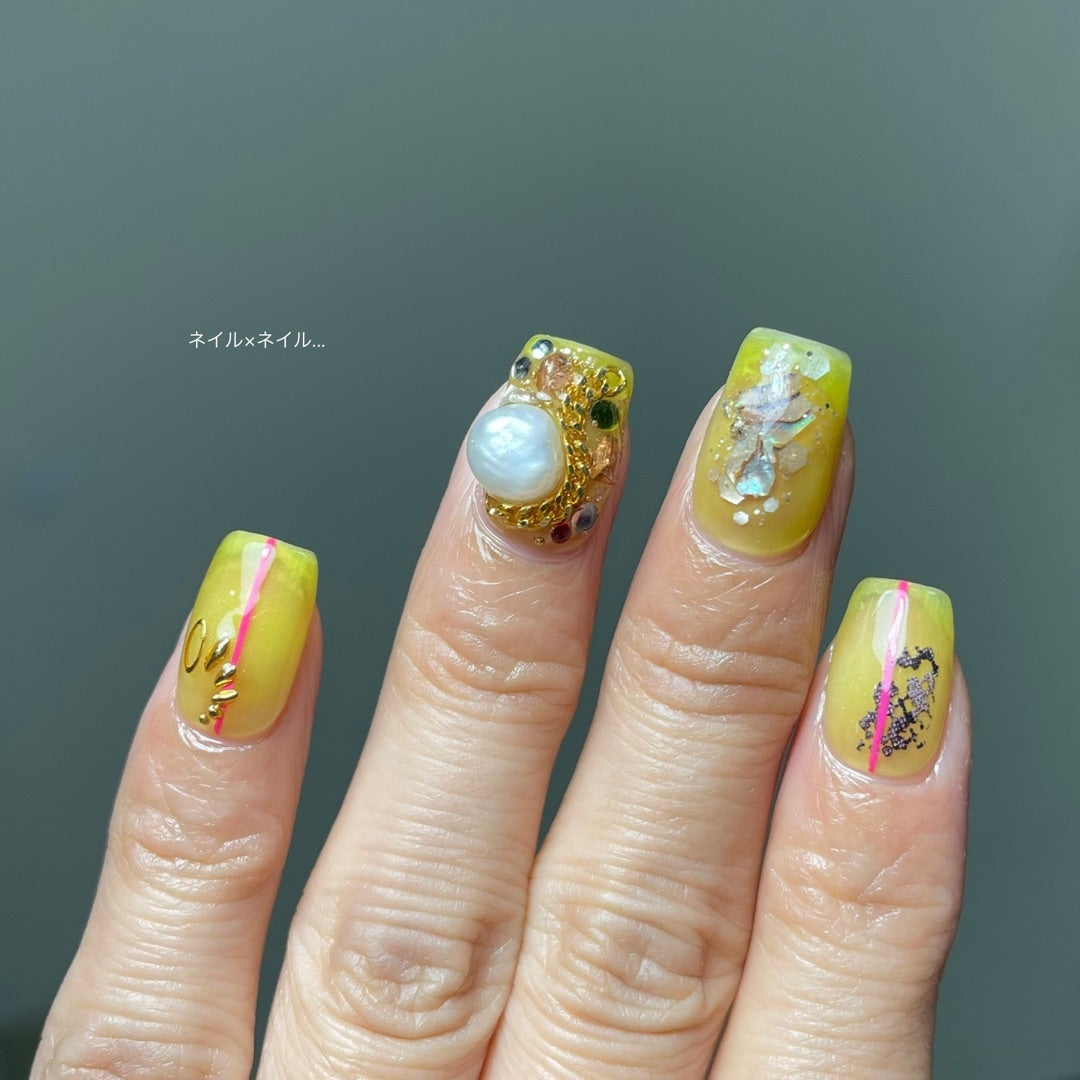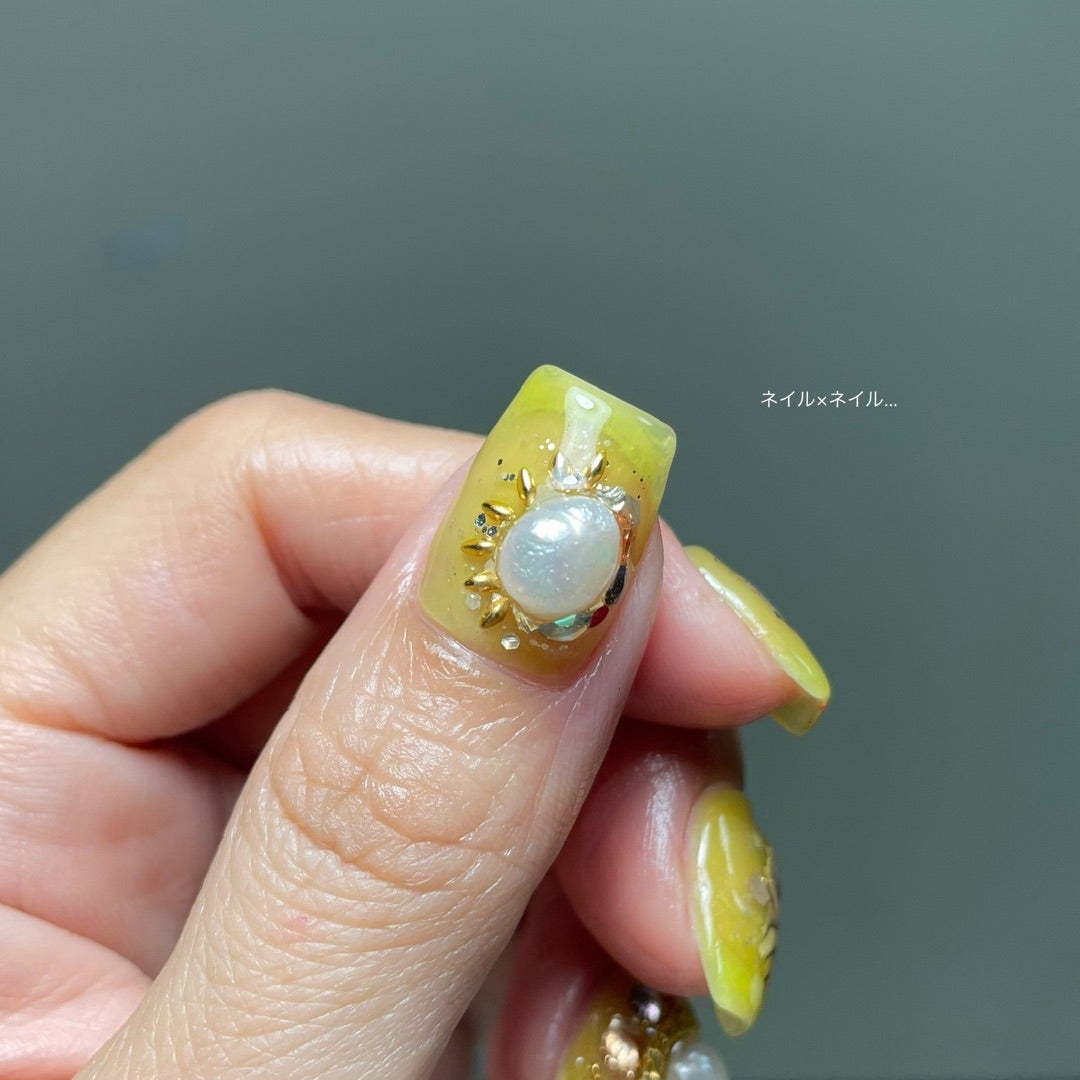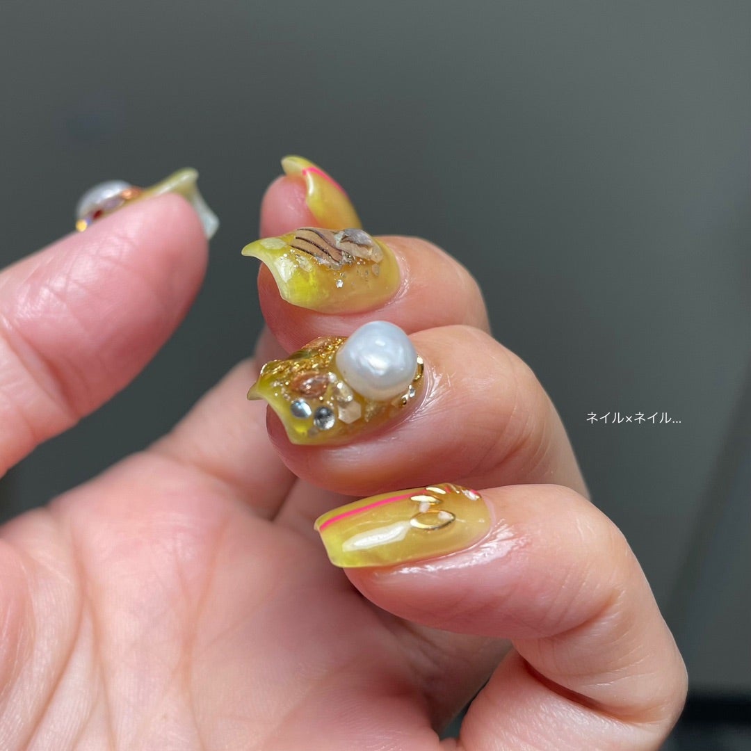 クリアイエローと淡水パールのごちゃごちゃネイル