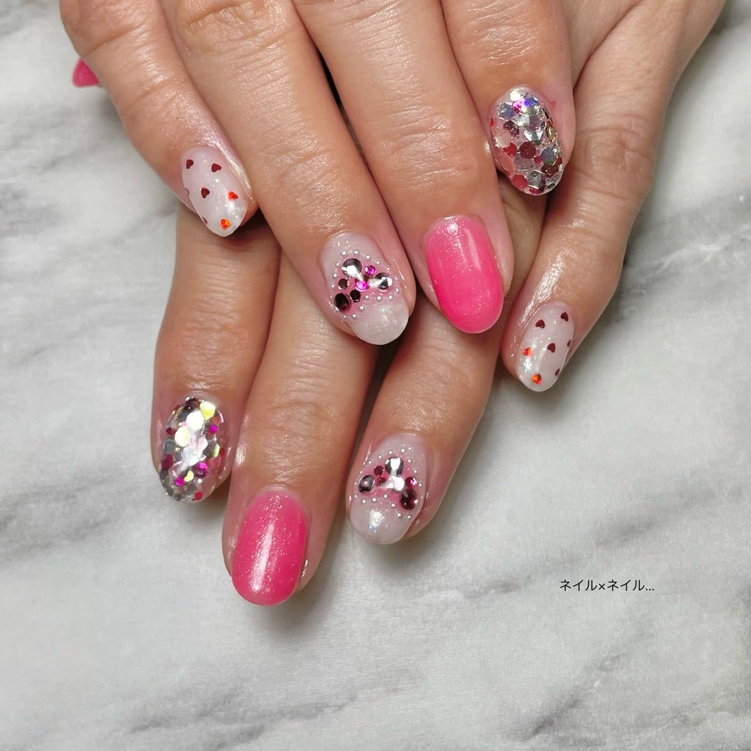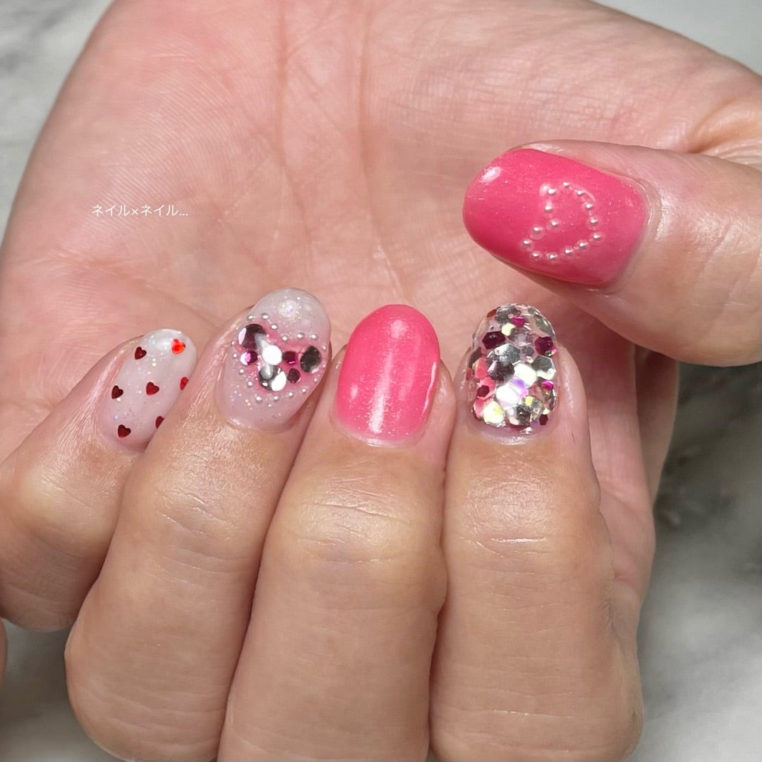 #ハートネイル #ハートドットネイル #ビビットピンクネイル #ジェルネイル #パールハートネイル #お持ち込みデザイン #ガーリーネイル #沖縄市ネイルサロン #沖縄市ネイルネイル #ネイルネイルゆきな #やらゆきなブログ